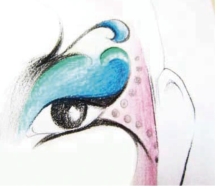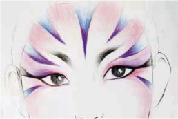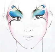 首先是构思眼部造型。以眼部位置为中心,夸张眼形并延伸。其次围绕眼形加强装饰线的布局。根据眼部周边的凹凸结构衬托眼形、眉形的美感。再将眼影、腮红、口红着色,也可以在唇部色彩设计上与眼部略加呼应。最后完成彩绘化妆的效果图。