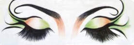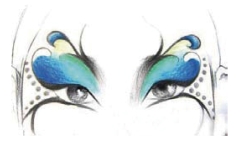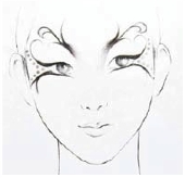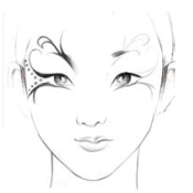 曲线的曲度组合的图形本身有一种圆滑、婉转、柔情、漂浮、随意等感觉。在彩绘创意妆形设计的过程中,要想使妆形体现出女性独有的柔美、妩媚及妖艳的妆面风格,曲线组合应用是不可忽视的。因此,运用曲线,学会夸张眼形、眉形或点缀图形,最容易达到这样的构思效果。