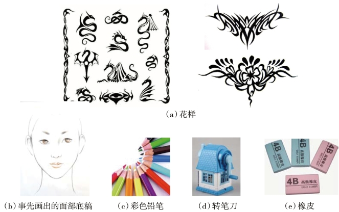 事先画出面部图稿,复印多份待用,准备简单的曲线图形资料、彩色铅笔、橡皮、转笔刀等。