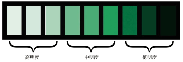 (2)明度:明度指色彩的明暗程度。明度也称为光度、亮度、深浅度。在无彩色系中,白色明度为最高,黑色明度最低。在有彩色系中,黄色最为明亮,紫色最暗。黄色和紫色在有彩色的色相环中,是划分明暗的中轴线。任何一个有彩色掺入白色,明度会提高;掺入黑色,明度则会降低。掺入灰色时,依灰色的明暗程度体现相应的明度色。(如图1-3-6所示)
