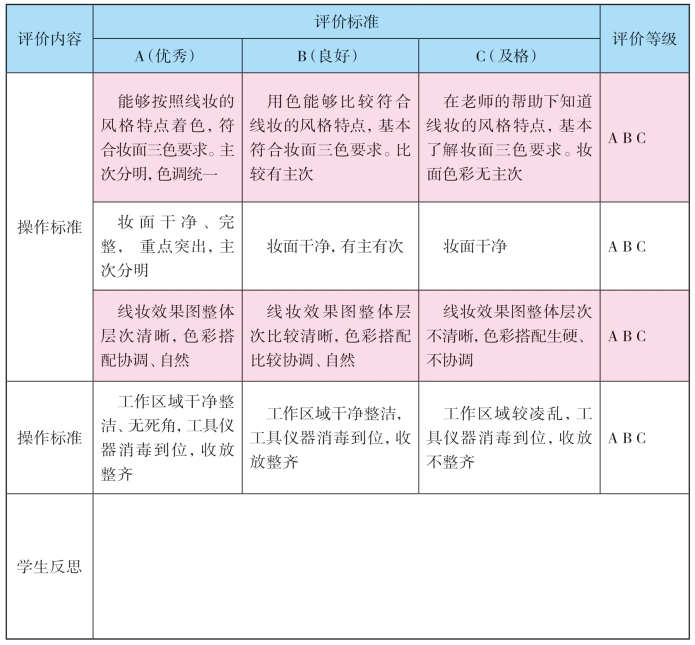 本项目的学习已经完成,根据作品的完成效果,检验所学知识的掌握情况。曲线妆形设计效果图检测表如表1-3-2所示,请在相应的位置画“√”,将理解正确的内容写在相应的位置。