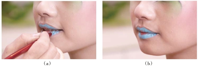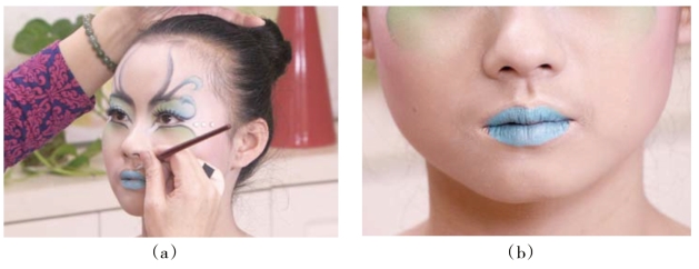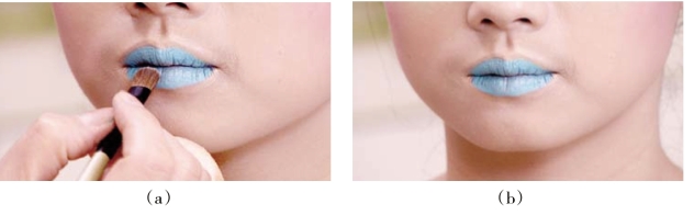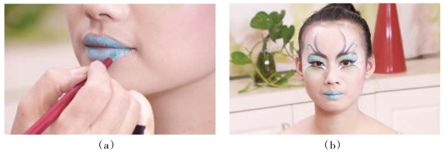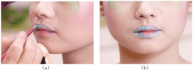 根据模特唇的特点,用唇彩笔蘸蓝色油彩画出唇线。