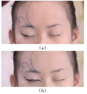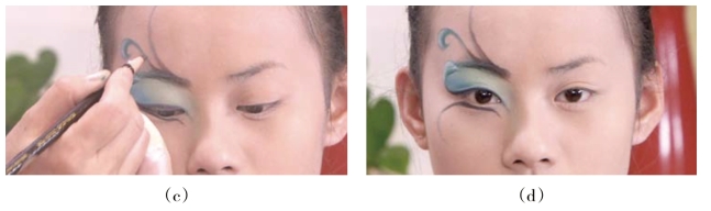 分析与解决:首先在妆面确定妆形位置和方向时,要用小号笔完成,并且线条从中间分别往两边画,画的长度要短于设计的长度,然后再用干净笔将两边晕染虚些。这样就可以使妆面线条比较虚实自然。