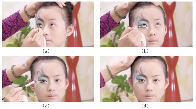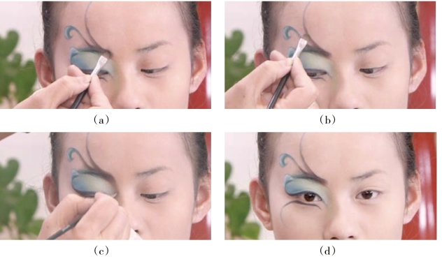 ①用眼影刷蘸翠绿色眼影粉将图形边缘颜色晕开,使妆面曲线有虚实变化。