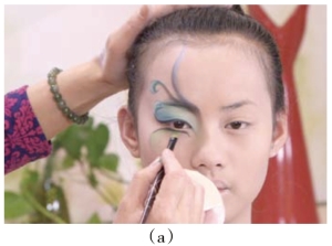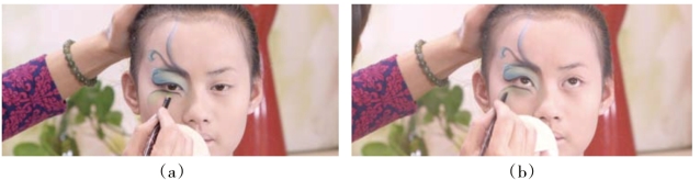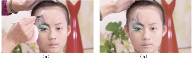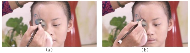操作妆面图形色彩或线条虚实时,晕色的笔要注意清理干净,确定涂色的方向和笔触的轻重,注意控制好手劲。