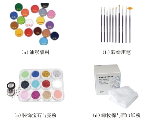 彩绘创意化妆应用的用具可以使用专业的化妆用具,另外,再备几支由小到大的勾线笔和油彩颜料、装饰宝石与亮粉、卸妆棉与面巾纸等。