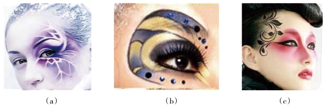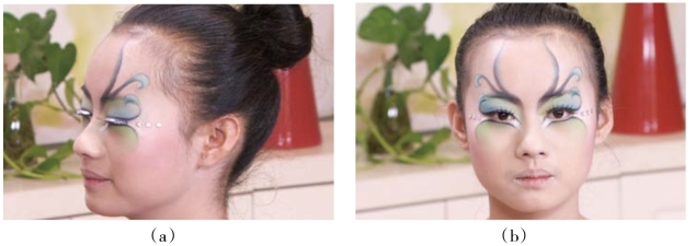 (2)曲线妆形中的眉毛设计一般不是常见的标准眉形,要将重点放在眉头位置,与眼窝、鼻梁自然衔接,并准确地强调出结构线。因此,眉头与鼻侧影的晕色很重要。