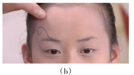 (4)观察模特的面部结构,分析是否适合所设计的妆形操作。若难度较大,可以对妆形设计稍加修整。如:眉眼之间距离较小,眼影部位无法设计效果,经过考虑后可以适当地更改效果图的局部。