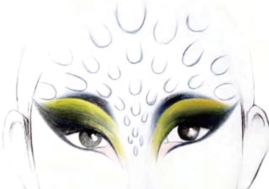外眼角向斜上方延伸,内眼角向斜下方延长,形成面部两边图形的界线,使妆面图形有疏有密。
