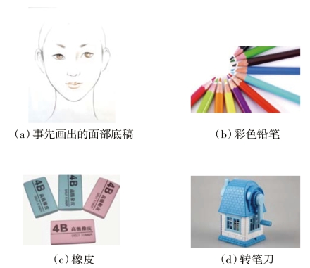 事先画出面部图稿,复印多份待用。简单的点组合的图形资料(或制作一些形状点的模板)、彩色铅笔、橡皮、转笔刀。(如图2-1-5所示)
