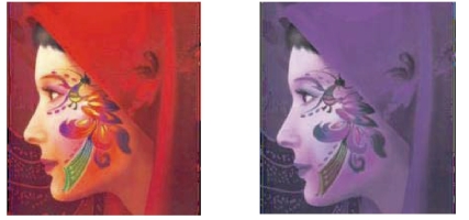 色调有多种:冷色调、暖色调、灰色调、黄色调、紫色调、亮色调、暗色调等。色调要依妆面的主题风格来确定。如喜庆、热烈的效果常常选用暖色调;平静、肃穆的场面常常选用冷色调;表达甜美、典雅的风格,一般采用中性明度的色调,如橙色、淡绿色、淡黄色等;表达欢乐、活泼、明快的主题,往往选用亮色调;表达含蓄、深沉的题材,则采用暗色调。下面红色调与紫色调所产生的妆面气氛就不同。(如图2-1-6所示)