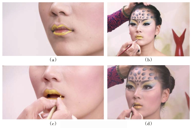 ③在嘴角处用金色油彩涂色,与黄色晕接,强调唇的凹凸感。