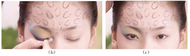 ②上眼帘:按照眼线的位置,用两色完成眼影。从外眼角至眼根部用中号眼影刷蘸深蓝色眼影晕染,内眼角用黄色晕染,与蓝色衔接。