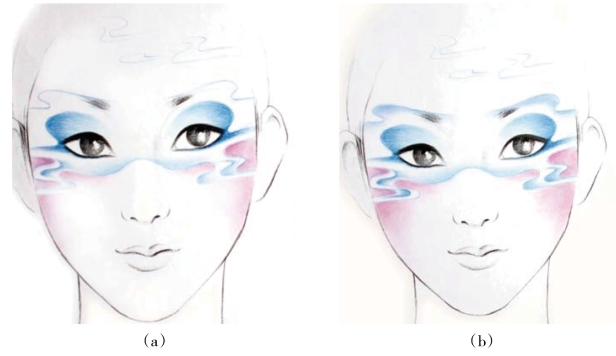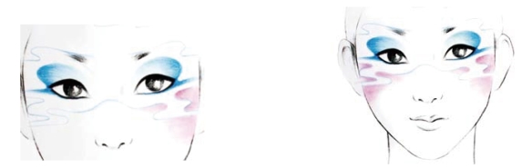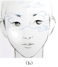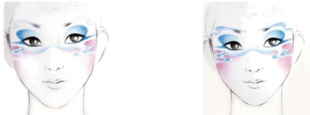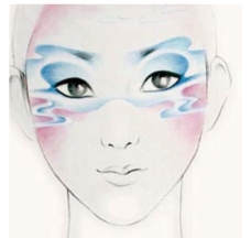 (2)效果图的妆形:在妆面中根据妆形的需要,云的图形不宜过大,线条也不宜过于死板生硬,要舒展轻松。云的线条若画在眼帘上,其颜色及线条可以淡化、虚化,保证眼妆的美感。