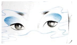 ①用湖蓝色彩铅将外眼角画长,与眼影弧度末端衔接,使眼角呈现云尾的效果。