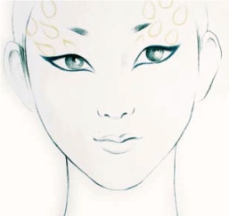 借鉴孔雀眼睛的形状夸张眼形,将眼睛形状拉长,向上挑高,呈凤眼造型。内眼角向下画尖。