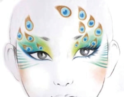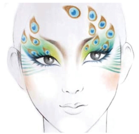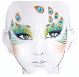 化妆行业中的孔雀妆是指面部妆形中有孔雀元素的妆形效果。孔雀妆不是固定的妆形,但它们都具有孔雀突出的形与色的特征。孔雀的结构造型比较复杂,在绘画上可以将它描绘得细致入微,但在化妆中,面部的美感主要是眉眼的协调、眼部的神韵及面色的靓丽。孔雀图形的装饰在面部不能太复杂、太显眼,否则,就会失去装饰及衬托妆面的作用。