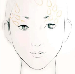 在眼部上面眉骨周边画出孔雀尾部斑点图形,向额头扩散排列,斑点呈穿插错位排列。眉骨两边可以不对称。但图形向上流动的方向要一致。