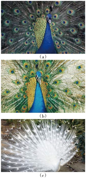 说到孔雀造型、色彩的美感,主要是针对雄性孔雀的开屏效果。孔雀从色彩品种上分为白孔雀、蓝孔雀、绿孔雀三种。(如图3-5-1所示)
