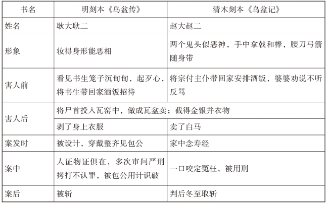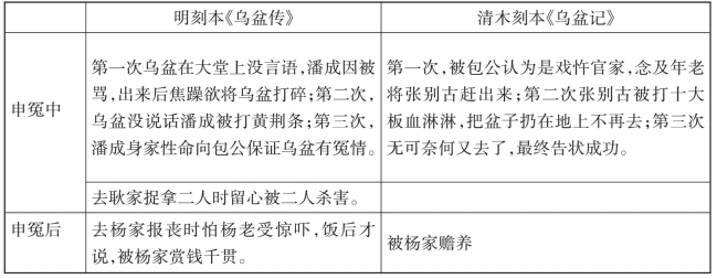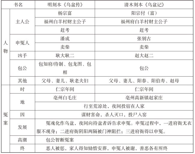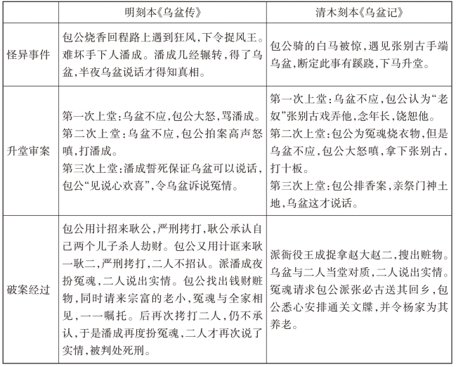 包公形象:包公审案在“乌盆故事”中占有非常大的比重,而包公破案的经过是故事亮点和高潮部分。明刻本和清刻本都对这个情节施以重墨。但是在情节处理和人物处理上却有所区别,这也符合包公故事的发展演变规律。(见表2-7)