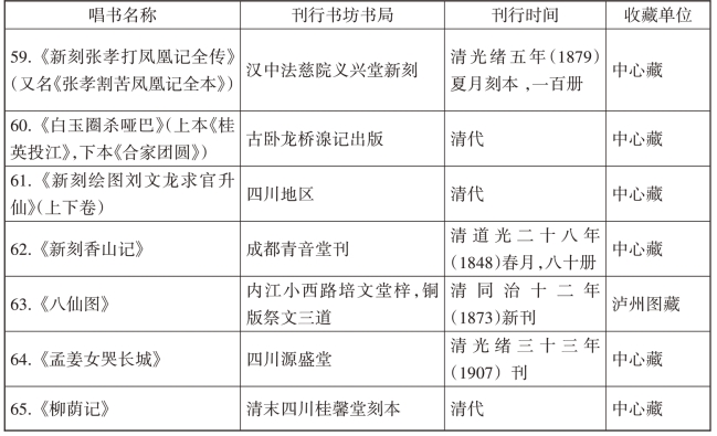 根据所查阅、收集到的唱书资料推断,在清代至民国初年,四川地区书坊雕版印刷并发行的“唱书类”图书数量在长江流域各省中是比较多的。这些唱本图书主要刊行于清同治至民国初年间,内容大多是清代以及清代以前的历史故事、传奇故事、现实故事等,但几乎没有涉及四川本地区的故事,这说明四川地区的“唱书”曲艺应是从邻近的省份传入的。