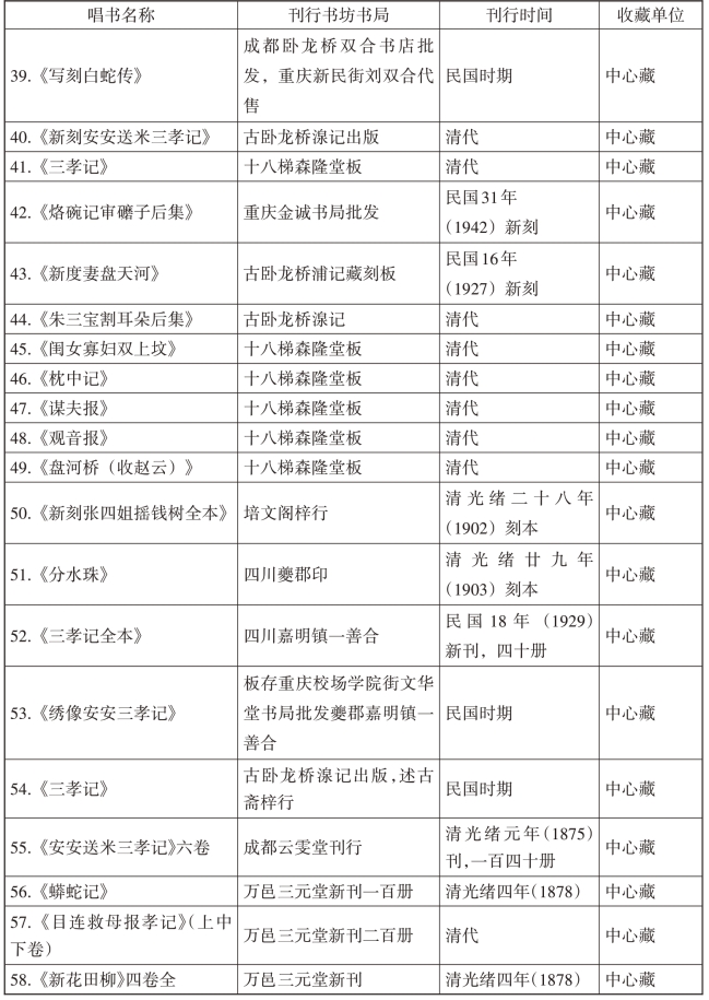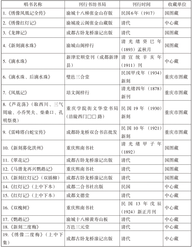 从目前收集到的清代民国初年四川地区“唱书类”唱本资料记载(不完全统计),当时四川地区刊行“唱书”的书坊有:成都的古卧龙桥湶记、杨记、浦记、和记、成发堂、云雯堂、新津宏顺堂、二合书社、文德堂书坊;重庆的渝城十八梯张金山、黄寿山、森隆堂书坊、渝城山阁书局、金城书局、熙南书社、校场学院街文华堂书局;夔郡、嘉明镇一善合书坊;万邑的三元堂;南充的药王街善仁书店;叙州的学院街书坊;内江的荣昌堂书坊;邛州刘盛兴双发堂。如果按“唱书”封面上所印每次发行册数来看,有四十册、一百册、一百五十册不等,最多不超过三百册,这些书坊所发行“唱书”种类大约有一百余种。