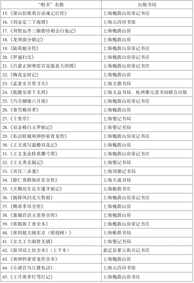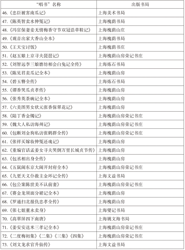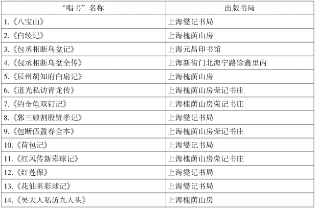 根据表7-1上海图书馆现存所藏资料,清末民初出版“唱书”的主要书局有上海槐荫山房、上海槐荫山房荣记书庄、上海燮记书局、上海文益书局、上海刘德记书局、上海元昌印书馆、上海文德书局、上海炼石书局、上海美术书局等。