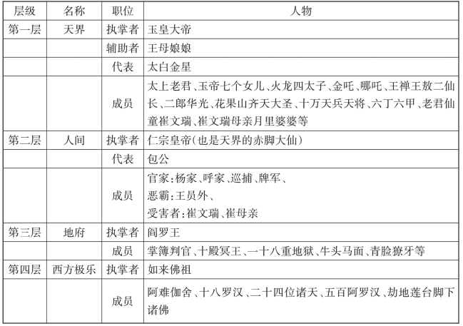 唱书《新刊说唱摆花张四姐出身传》中的神仙角色勾画了一幅完整的“民间信仰体系”建构图。主要人物集中在前三层,第四层只是简略提了一下。见表12-1。