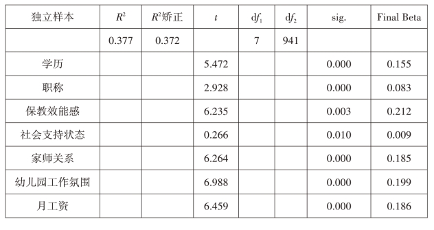 为了更彻底地了解教师因素和师幼关系,以及确定哪些因素对师幼关系的影响最大,我们对于数据(幼儿园教师师幼关系、学历、职称、幼儿园教师保教效能感、幼儿园教师家师关系、幼儿园教师社会支持状态、幼儿园工作氛围、月工资等)进行了多元回归分析。结果显示,学历、职称、幼儿园教师保教效能感、家师关系、社会支持状态与幼儿园教师师幼关系存在显著的多重线性关系。自变量解释了整个因变量变异程度的37.2%(矫正的R2=0.372)。建立标准化的回归方程为: