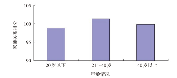 以年龄为自变量(20岁以下、21~40岁、40岁以上),幼儿园教师家师关系得分为因变量进行单因素方差分析。结果发现,幼儿园教师的家师关系得分不存在显著的年龄差异,F(2,946)=1.47,P>0.05。该结果表明,幼儿园教师的家师关系与年龄无关。