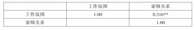 对幼儿园工作氛围得分及幼儿园教师的家师关系得分进行皮尔逊相关分析,结果发现,幼儿园工作氛围得分及家长和教师关系得分之间存在显著相关(r=0.316,P<0.01)。该结果表明,幼儿园工作氛围越好,其家师关系越好。