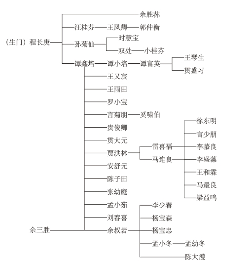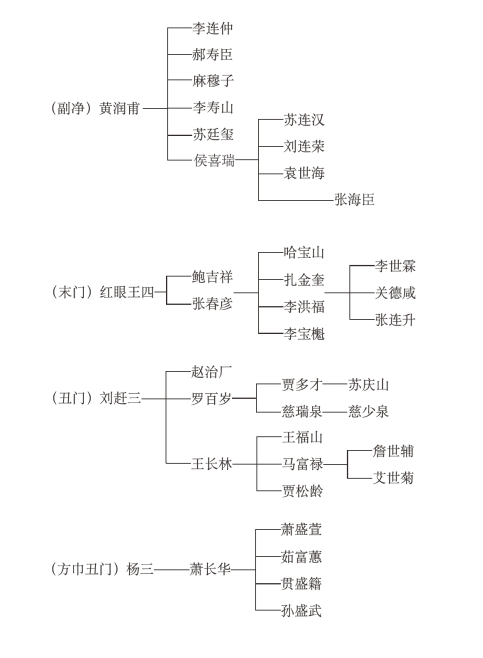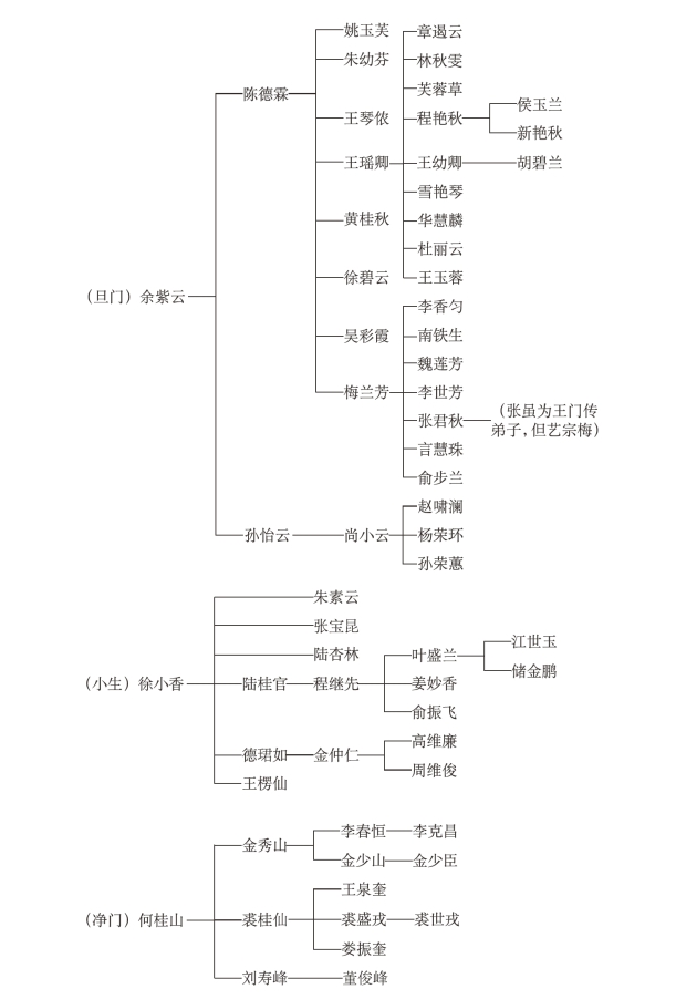 各门中具直接正统者,余得十三人,绝无阿谀私好之意,计老生门为孟小冬,旦门为张君秋,净门为王泉奎,副净门为袁世海,末门为鲍吉祥,丑门为萧长华,小生门为叶盛兰,花旦门为翠花,老旦门为李多奎,武生门为茹富兰,武净门为钱宝森,武丑门为叶盛章,武旦门为李金鸿。读者由表上观之即可明了矣。附表如下: