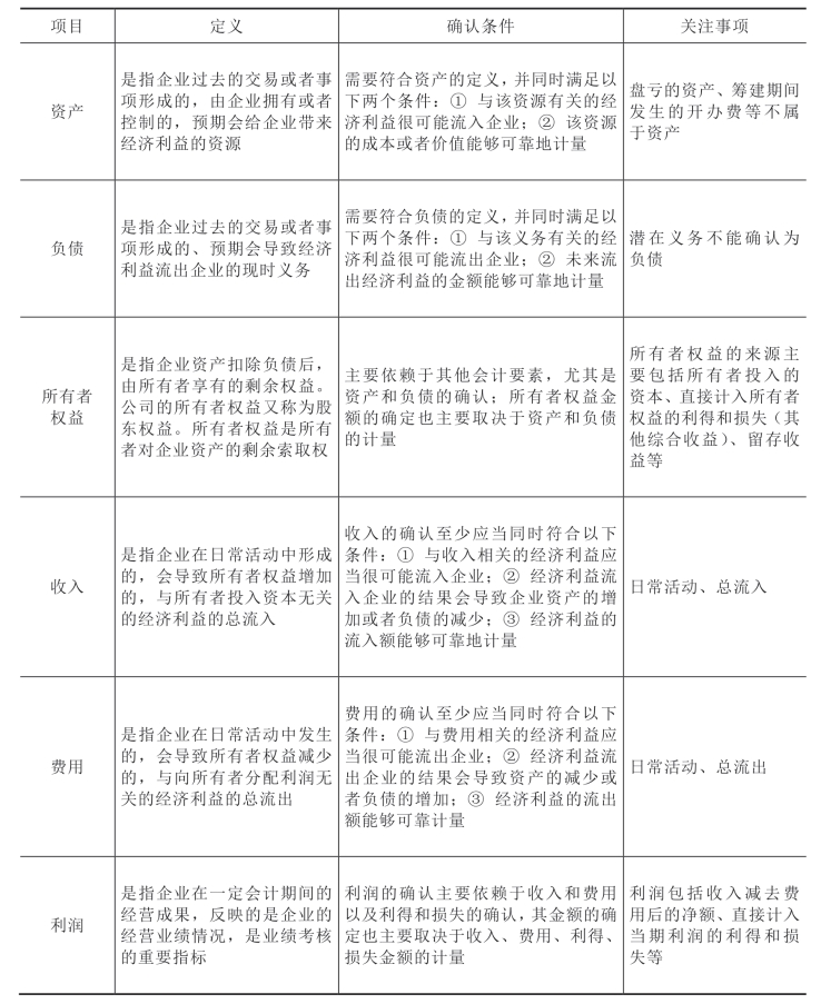 会计要素的定义、确认条件及其关注要点见表1−4。