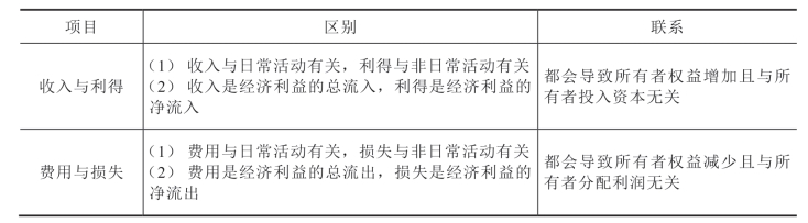 上述会计要素的概念中,尤其要注意收入与利得、费用与损失这两组概念,它们之间的区别与联系见表1−5。