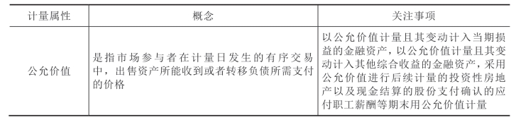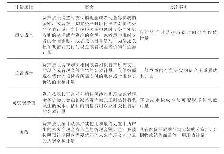 企业在将符合确认条件的会计要素登计入账并列报于财务报表时,应当按照规定的会计计量属性进行计量,确定其金额。会计计量属性主要包括历史成本、重置成本、可变现净值、现值和公允价值等。企业在对会计要素进行计量时,一般应当采用历史成本。采用重置成本、可变现净值、现值、公允价值计量的,应当保证所确定的会计要素金额能够取得并可靠计量。会计要素计量属性的概念内涵及注意事项见表1−6。