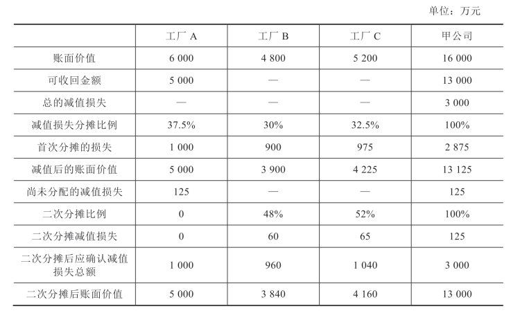 分摊减值损失160万元后,甲、乙资产组的账面价值5 840万元(1 200+2 100+2 700−160)大于该资产组的未来现金流量现值5 538万元,故甲、乙车间构成的资产组应确认的减值损失为160万元。