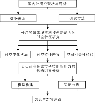 首先对国内外相关研究进行综述和评析,然后确定数据来源与研究方法,继而进行实证。主要分为两部分:第一,长江经济带城市科技创新能力的时空特征研究,分别从时空变化格局、时空特征差异和空间相关性检验三个方面进行分析;第二,长江经济带城市科技创新能力的影响因素分析,包括模型的构建和回归分析。最后得到结论并提出政策建议。