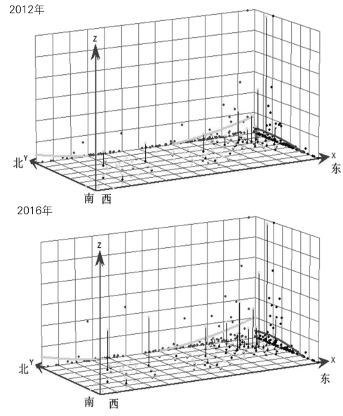 图1-5 2012年、2016年长江经济带发明专利申请量的趋势面分析