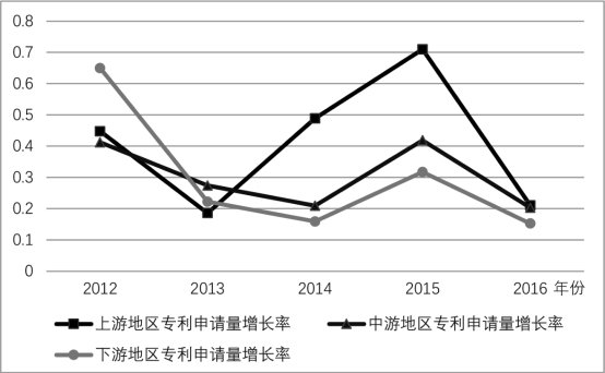 由长江经济带上、中、下游地区城市发明专利申请量的区位分布情况可以看出(图1-3),创新产出水平高的城市多位于长江下游地区,下游地区的城市创新产出占比达到80%左右,远远大于中游和上游地区的城市创新产出占比。长江上中下游地区的创新产出存在较大差异。但是从长江经济带上中下游2012—2016年的增长率水平来看,随着时间推移,长江上游的专利申请量增长率>长江中游的专利申请量增长率>长江下游的专利申请量增长率,表明长江经济带的创新产出差异正在逐渐减小,并存在均衡趋势(图1-4)。