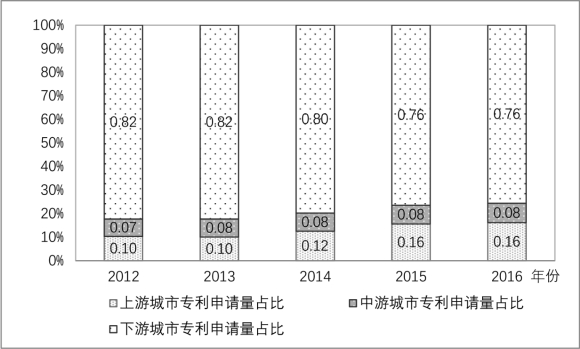 由表1-2可知,2012—2016年排名前20名的城市专利申请量占整个长江经济带108个城市的专利申请量的平均90%左右,且占比有逐年降低的趋势,于2012年的91.60%降低至2016年的87.81%,由此可知,长江经济带108个城市中科技创新能力较强的城市数量较少,科技创新能力差异较大,但随着时间推进这种差异存在缩小趋势。同时,前20名的城市中大约有75%的城市为下游城市,其数量大于中游和上游城市数量之和。由于科技创新具有较强的空间锁定和粘滞性特征,较多的科技创新活动发生在较少的城市中,并集聚产生于特定地区,2012—2016年间基本没有变化。