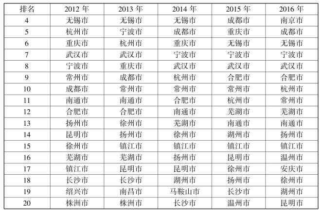 表1-1 2012—2016年长江经济带发明专利申请受理量前20名