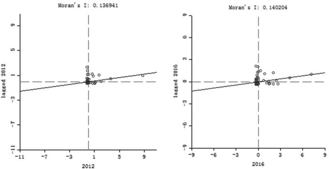 从2012年和2016年长江经济带城市科技创新能力的空间Moran散点图来看(图1-10),落在一、三象限的点较多,表明大多数城市表现为在地理空间上存在正的空间自相关。而落在二、四象限的点较少,表明高低类型和低高类型的城市为偏离全域正的空间自相关的整体创新趋势的城市,其科技创新能力的空间特征表现为非典型性。