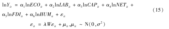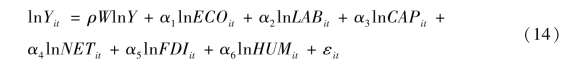 在上述模型基础上引入空间计量模型,故得到城市科技创新影响因素的空间滞后模型(SLM)为: