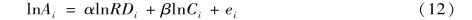 其中,A为新产出的知识,RD为研发支出,C为具有影响的经济变量,e为随机扰动项。对其两边取对数得到以下公式: