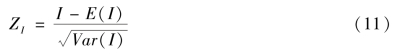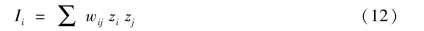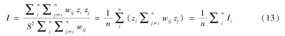 公式(12)中,zi与zj指代的是将观测值进一步标准化后得到的数值,wij则是把空间权重矩阵进行行标准化后的数值。全局Moran's I值和局部Moran's Ii二者间也存在一定的数量关系: