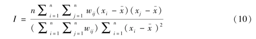 公式(10)中,n表示研究样本内的区域数量;其中与xj分别为地区i和j的属性值;