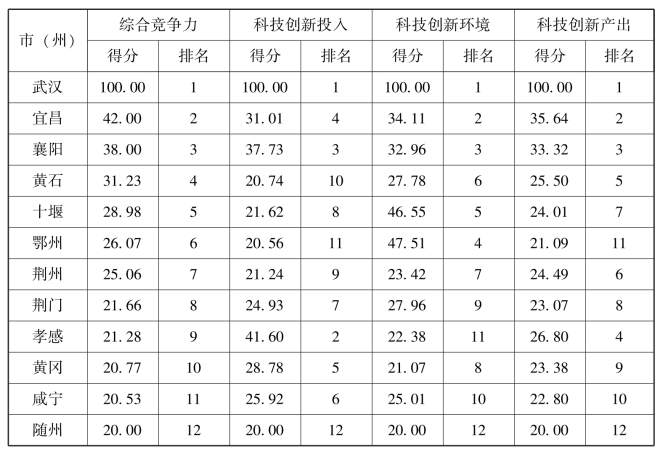 第二,湖北省主要城市科技创新子因素竞争力分析。主要从科技创新投入、科技创新环境和科技创新产出3个方面进行分析。