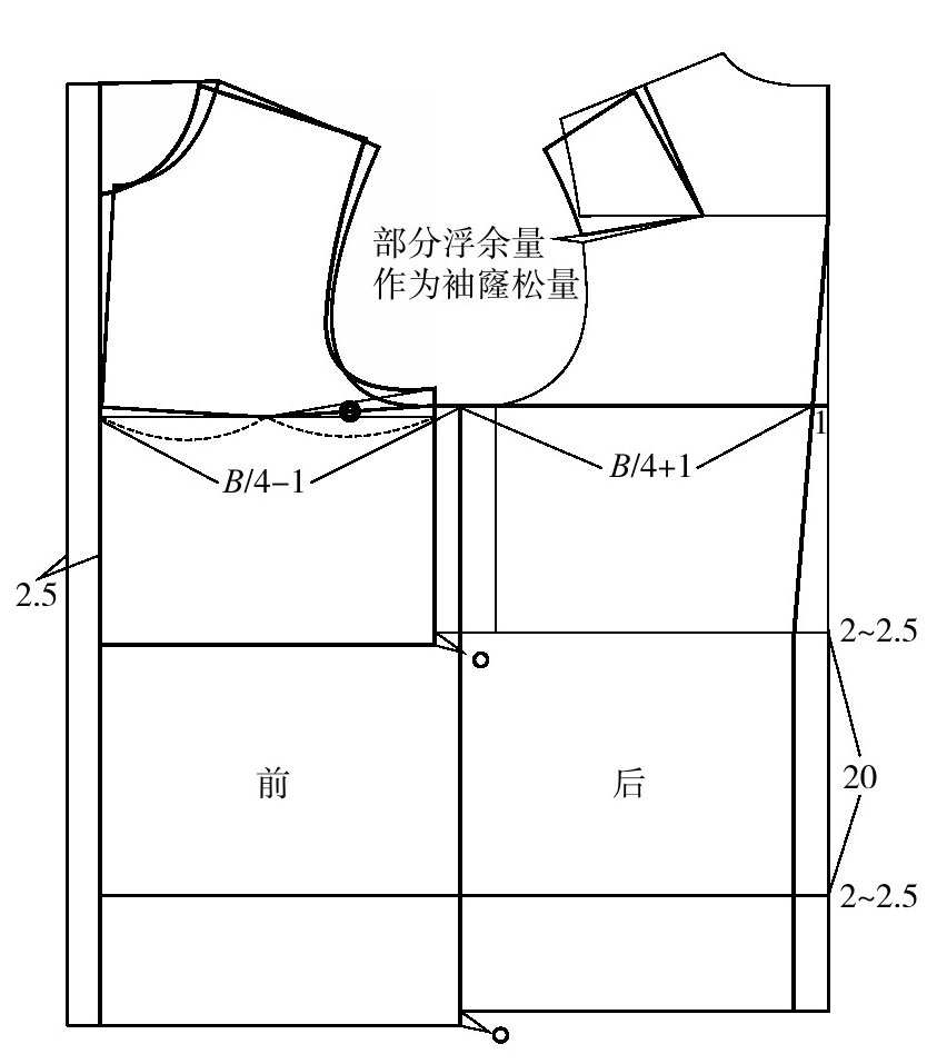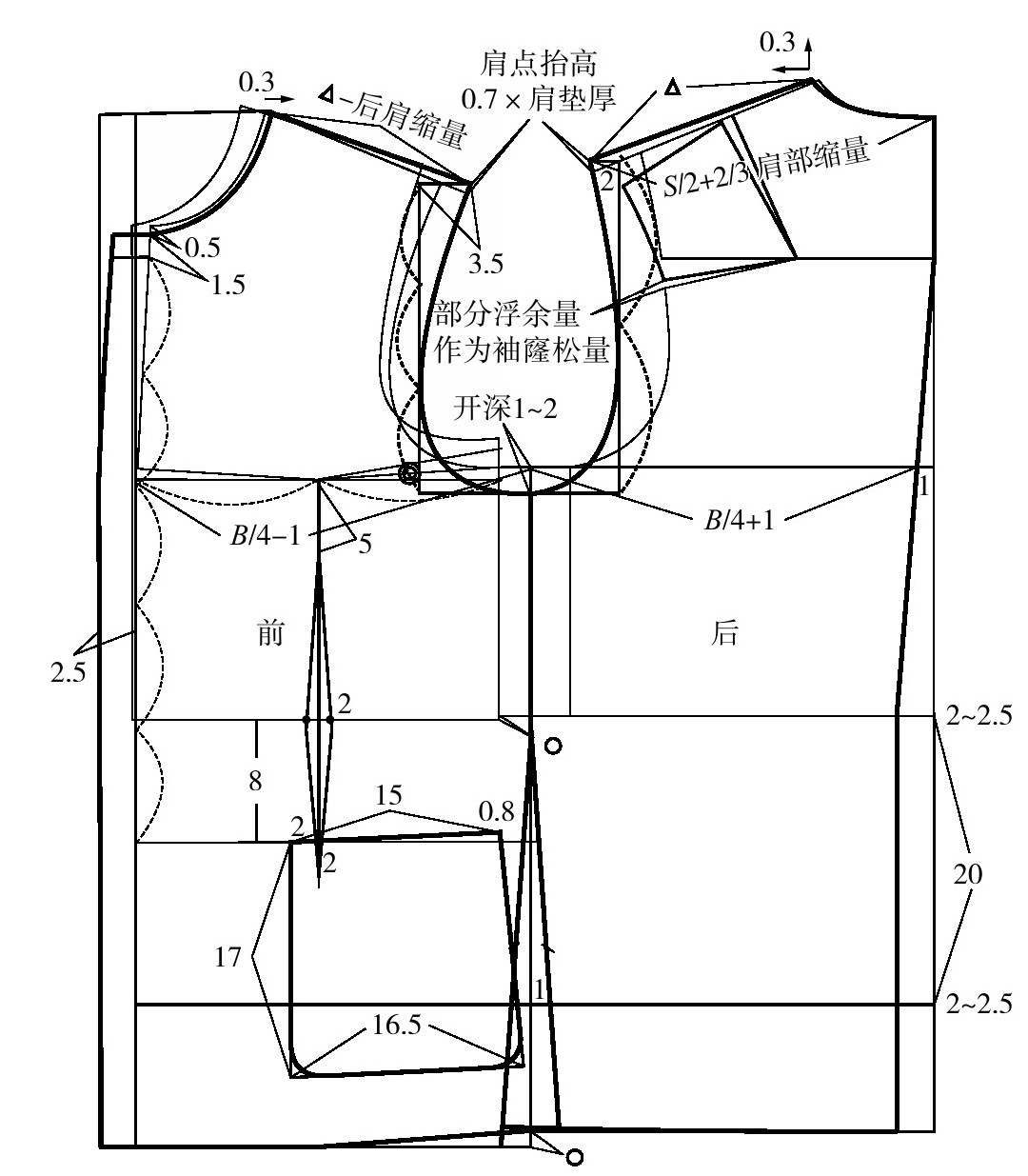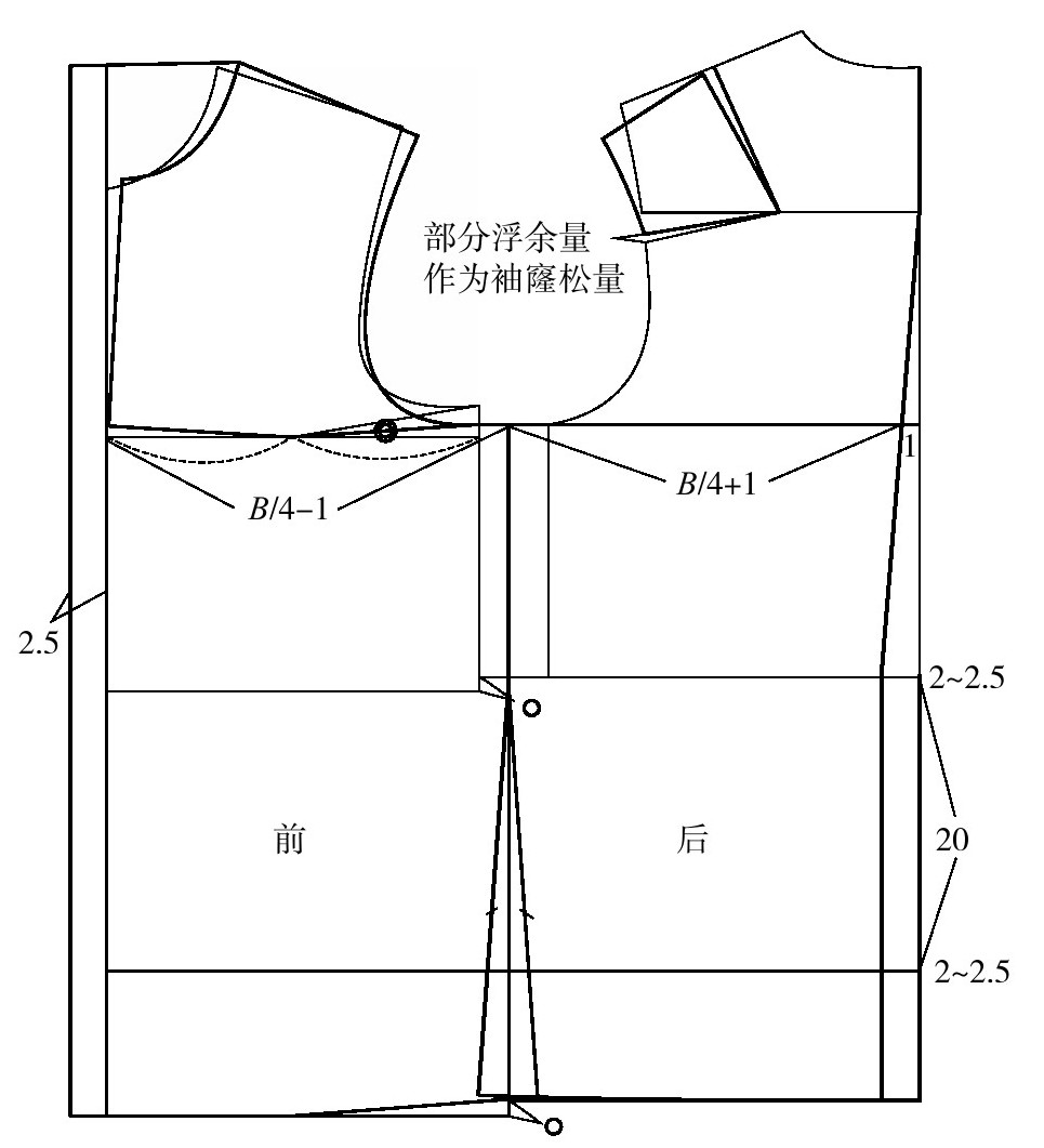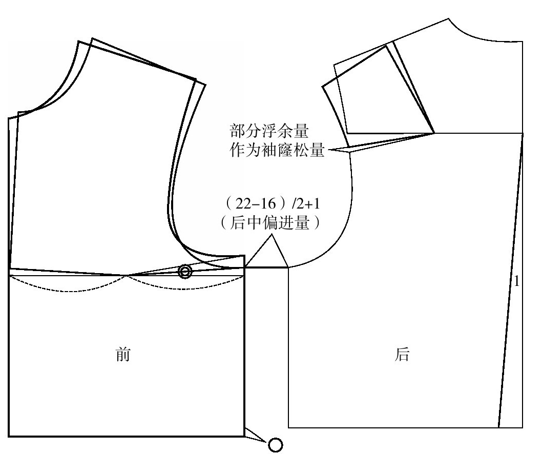 (2)前浮余量(剩余的)通过撇胸(自然撇门量为1cm)进行消除,剩余的部分以前腰围线下放进行消除;后浮余量(剩余的)在肩部转移0.7cm通过缩缝消除,余下的作为袖窿松量。