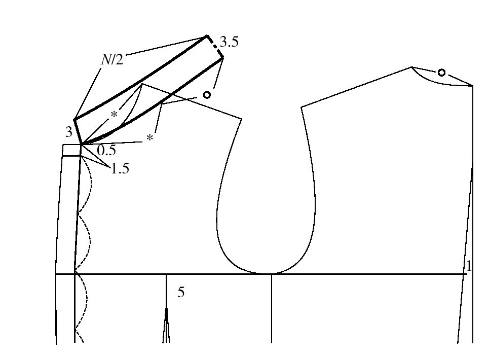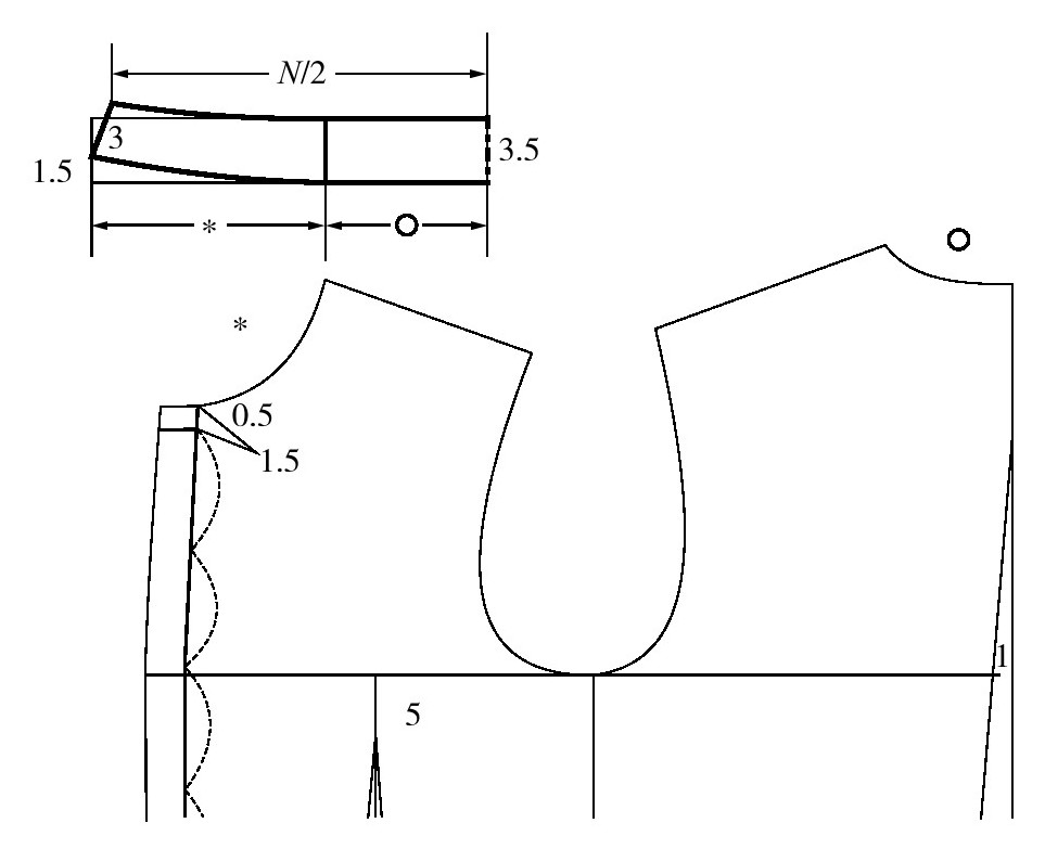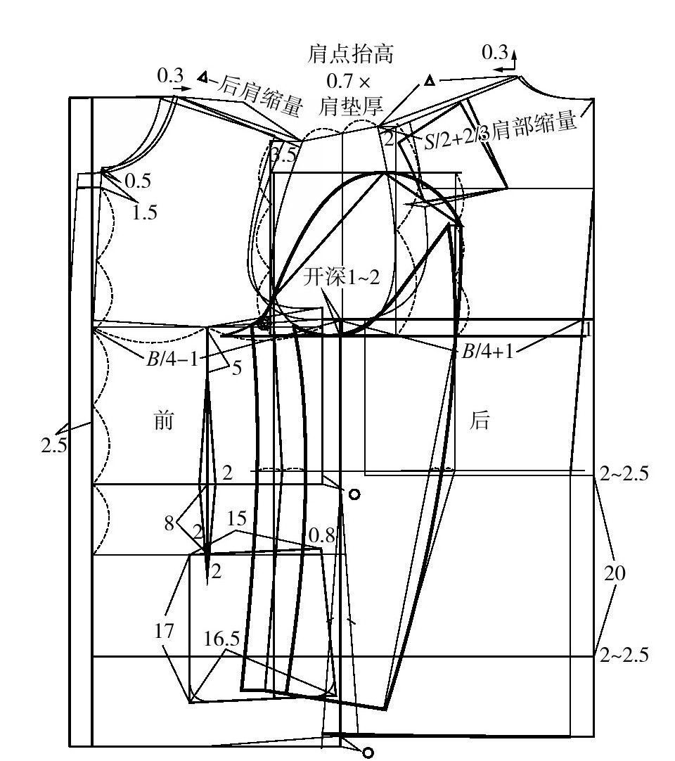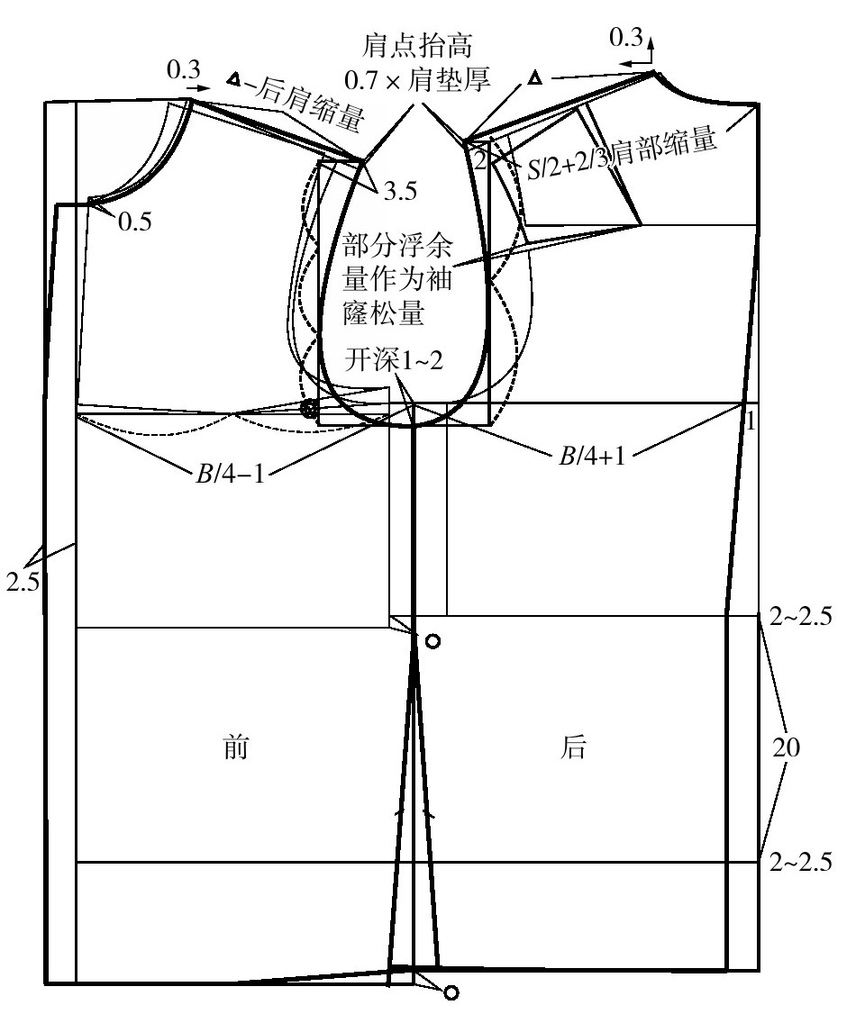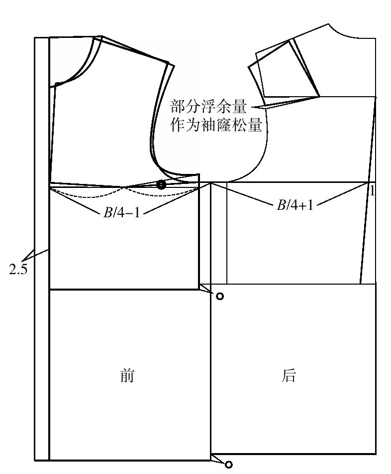 (2)前浮余量(剩余的)通过撇胸(自然撇门量为1cm)进行消除,剩余的部分以前腰围线下放进行消除;后浮余量(剩余的)在肩部转移0.7cm通过缩缝消除,余下的作为袖窿松量。