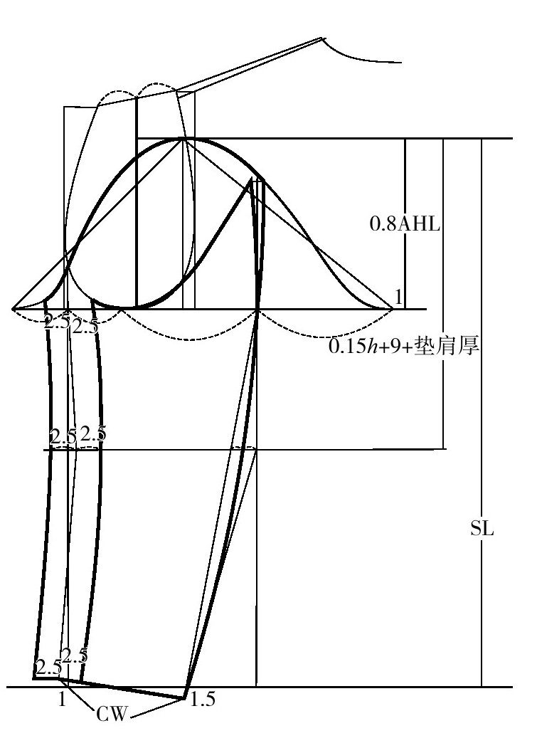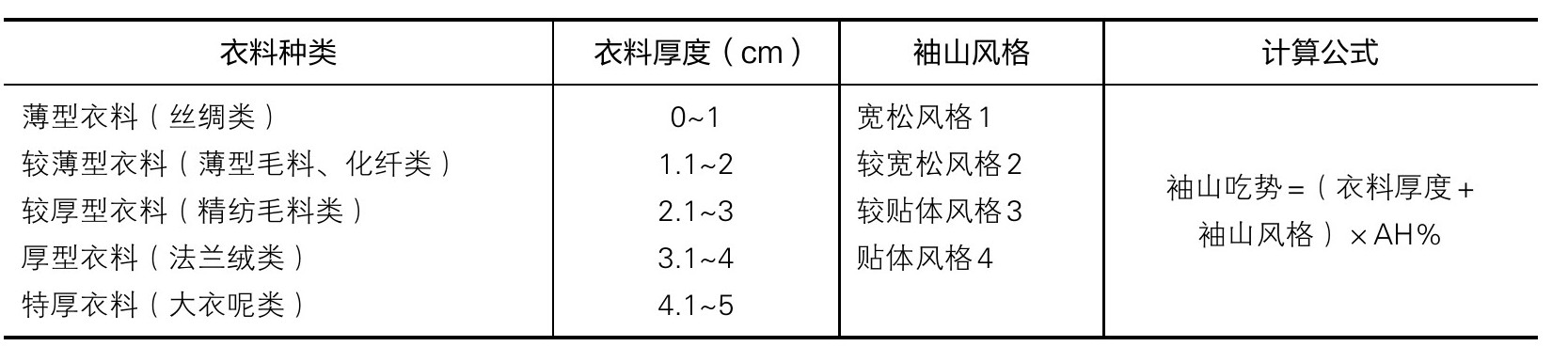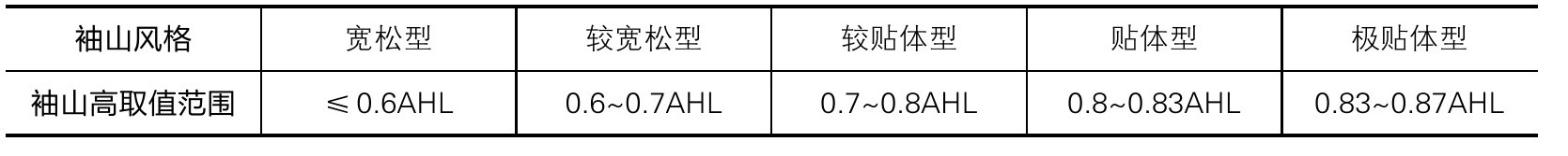 (4)确定袖山高,首先根据前、后袖窿的平均深AHL,袖山高按0.8AHL确定,袖子越宽松袖山越低,袖子越贴体袖山越高,如表2-15所示。